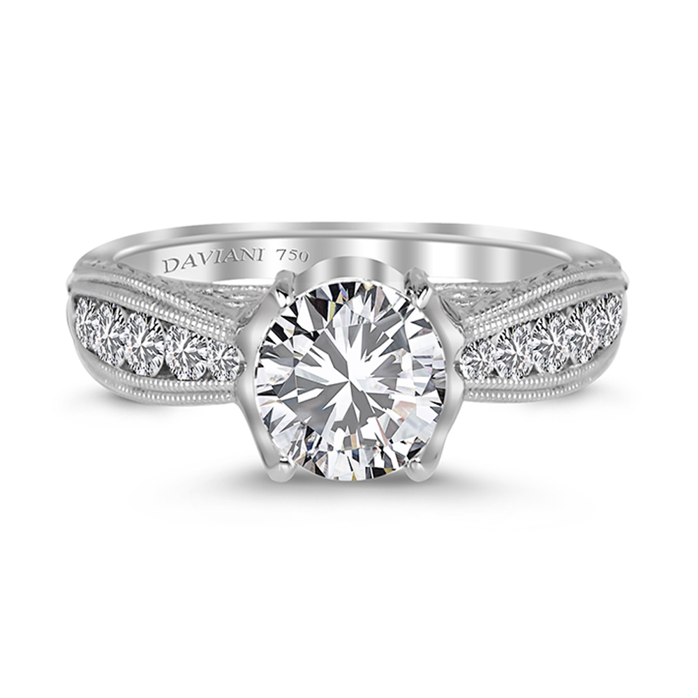 This Daviani diamond engagement ring, is made with 18Kt White Gold. The diamonds total carat weight is 0.48ct. Shank has a hand engrave design. Also available in 19Kt or Platinum.
