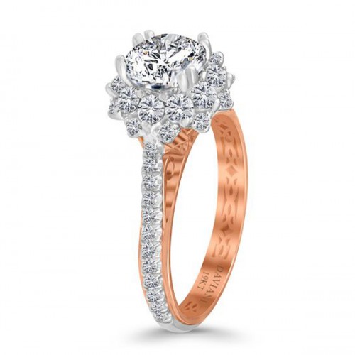 This Daviani round halo diamond engagement ring, is made with 19Kt White and Rose Gold. The diamonds total carat weight is 0.86ct. This ring has a matching band. Also available in 18Kt or Platinum.