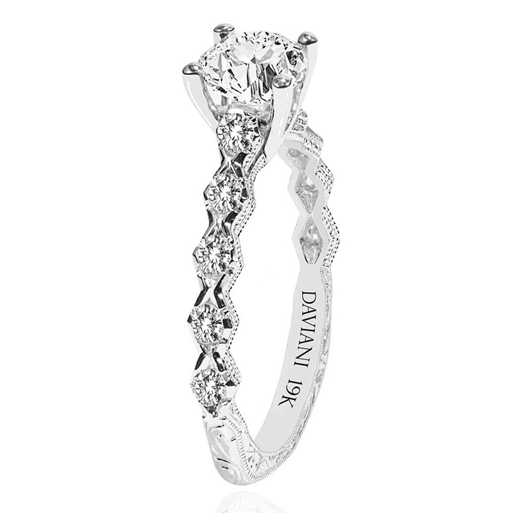 This Daviani diamond engagement ring, is made with 19Kt White Gold. The diamonds total carat weight is 0.33ct. Shank has hand engrave design. This ring has a matching band. Also in 18Kt or Platinum.