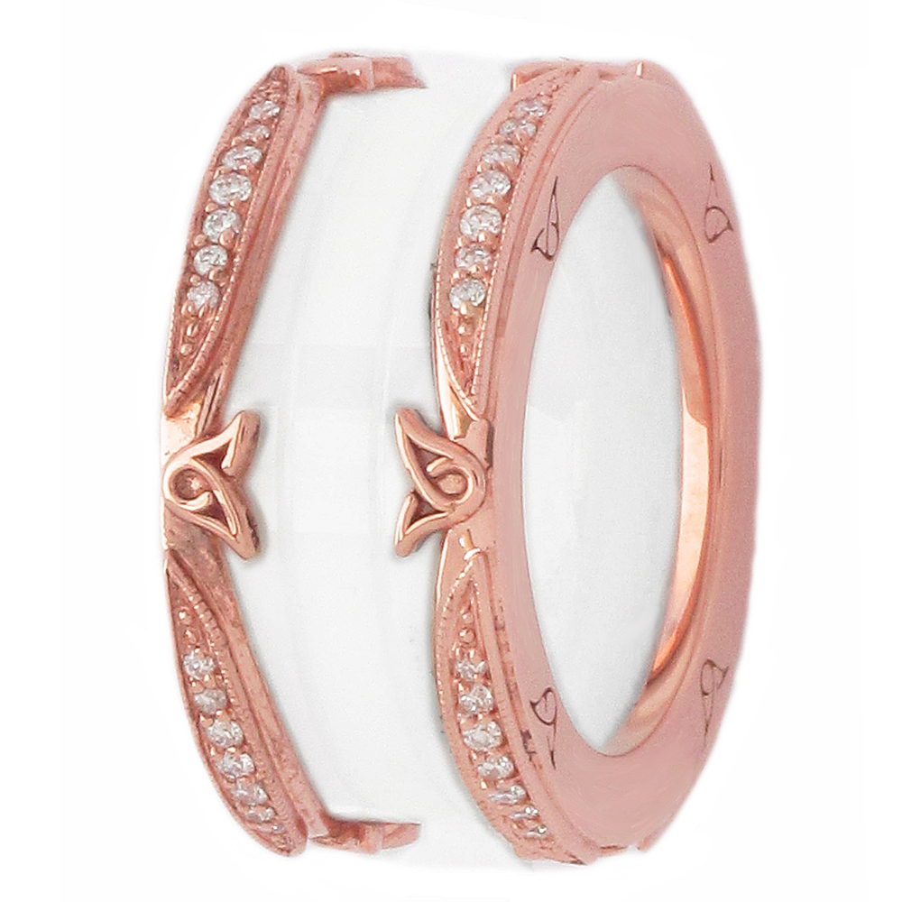 This Daviani band is made with 18Kt Rose Gold. It has a white ceramic. The diamonds total carat weight is 0.34ct. Also available in 19Kt or Platinum.
